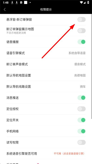 4、在權限提示頁面,找到懸浮窗新訂單彈窗選項,點擊其右側的開關按鈕,即可開啟懸浮窗口功能。