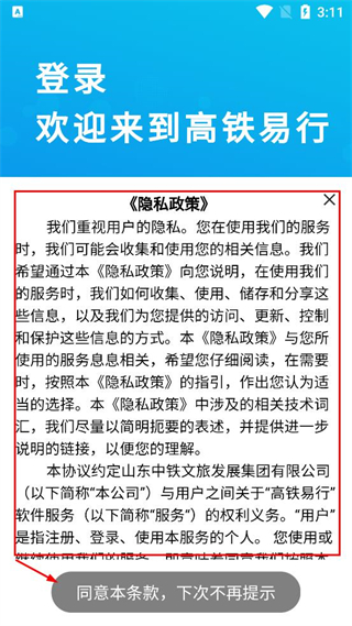 3、閱讀彈出的隱私政策內容,點擊同意本條款下次不再提示按鈕關閉該彈窗。