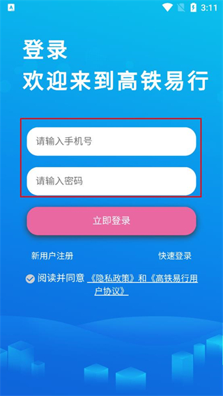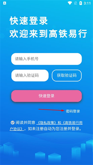 1、打開高鐵易行應用,在快速登錄頁面點擊密碼登錄選項,切換至密碼登錄界面。