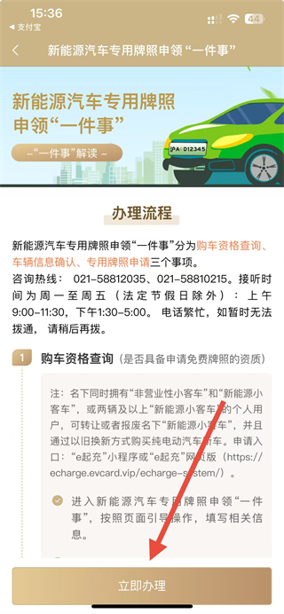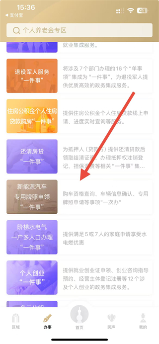 2、在辦事頁面中,找到新能源汽車專用牌照申領選項并點擊,進入該業務的專屬辦理頁面。
