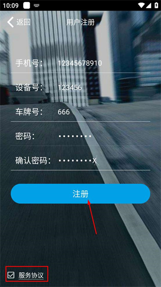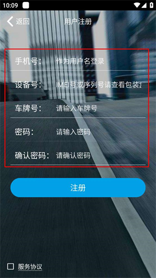 2、在用戶注冊頁面,依次填寫手機號設備號車牌號,再設置密碼并確認密碼內容。