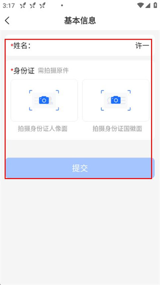 3、 在基本信息頁面填寫姓名、拍攝身份證人像面與國徽面,點擊提交。