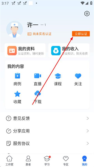 1、 打開妙手醫生醫生版app的工作室頁面,點擊底部我的。