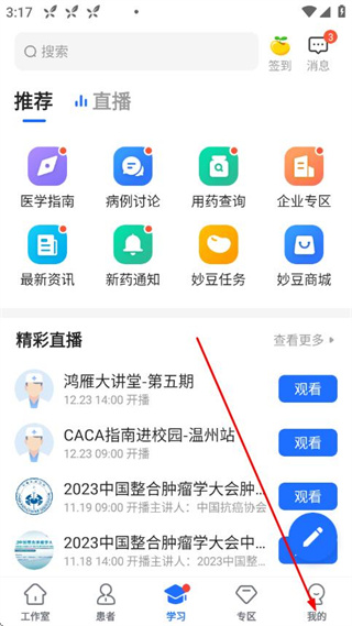 1、在妙手醫生醫生版app的“學習”頁面,點擊精彩直播右側的查看更多。