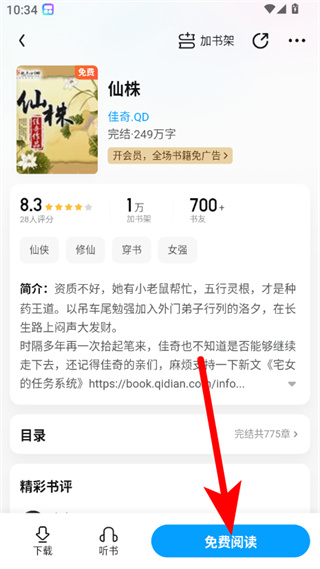 2、在書籍詳情頁,點擊免費閱讀按鈕,進入閱讀界面。