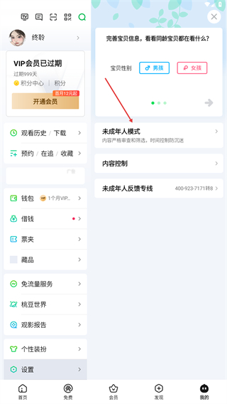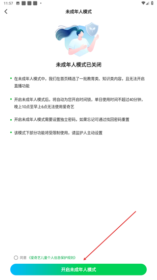 5、在頁面中了解協議后,再點擊開啟未成年人模式按鈕,即可啟用。