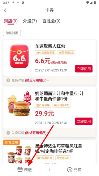 3、在卡券頁面底部,點擊贈送按鈕,進入贈送朋友頁面。