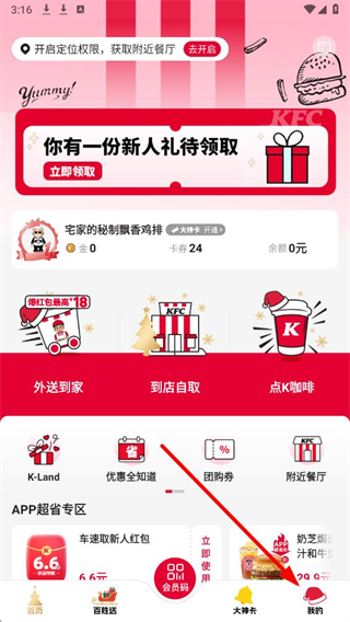 1、打開肯德基應用在首頁APP超省專區找到車速取新人紅包6.6元活動入口并點擊。