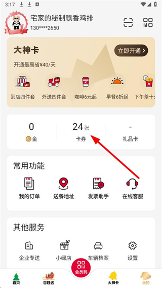 2、在我的個人頁面中,點擊卡券選項,進入卡券頁面。