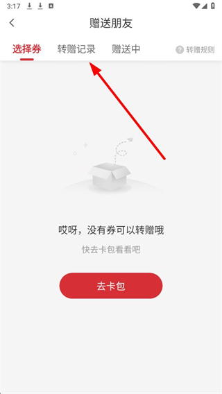4、在贈送朋友頁面,點擊頂部的轉贈記錄標簽,即可查看贈券記錄。