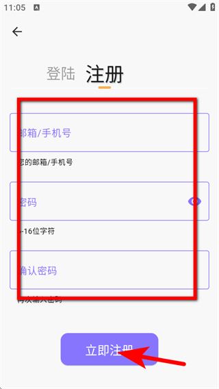4、填寫郵箱/手機號、密碼及確認密碼,點擊立即注冊,完成注冊操作。