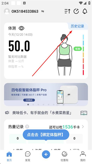 1、打開OKOK體脂秤,在首頁點擊右上角的歷史記錄。