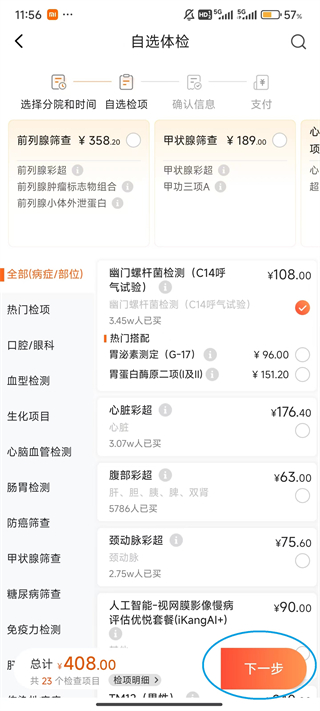 6、進入自選檢項頁面,選擇需要的體檢項目后點擊下一步。