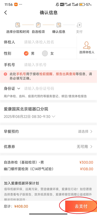7、在確認信息頁面,填寫體檢人信息,點擊去支付完成預約。