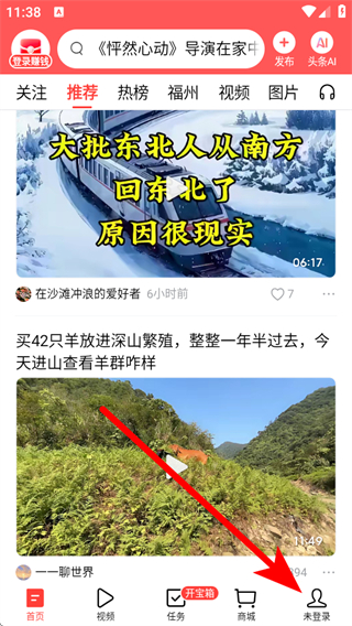 1、打開今日頭條,點擊底部未登錄,進入登錄相關頁面。