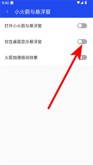 4、在小火箭與懸浮窗頁面,點擊僅在桌面顯示懸浮窗開關,完成設置。