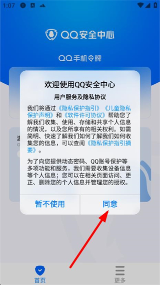 1、打開QQ安全中心app,在彈窗中,點擊同意按鈕。