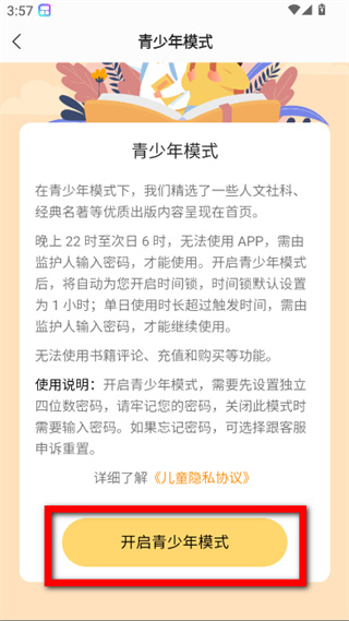 4、在青少年模式頁面,點擊開啟青少年模式按鈕,按提示完成設置即可。