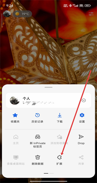 2、在功能菜單中,點擊“擴展”選項,進入瀏覽器的擴展管理頁面。