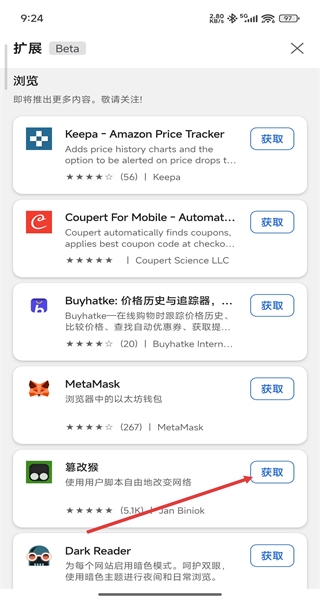 3、在擴展頁面的瀏覽列表里,找到目標擴展程序,點擊其右側的“獲取”按鈕。