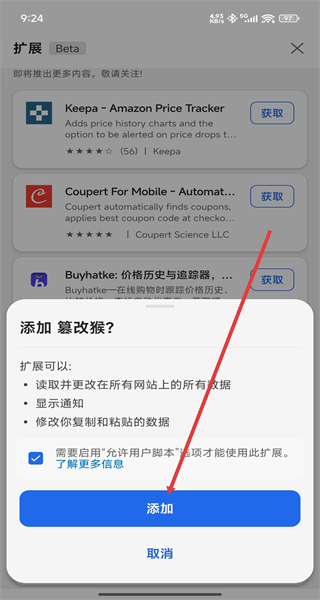 4、在彈出的確認彈窗中,點擊“添加”按鈕,即可完成該擴展程序的添加操作。