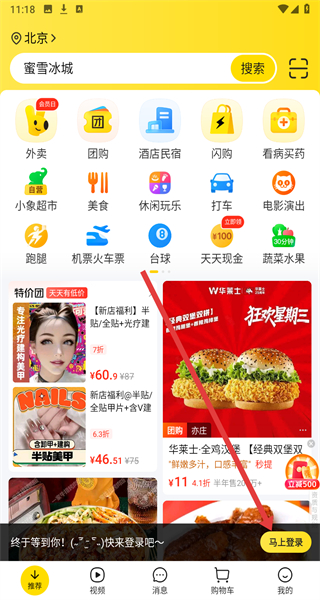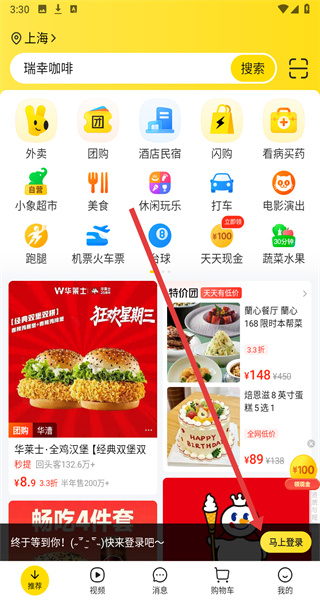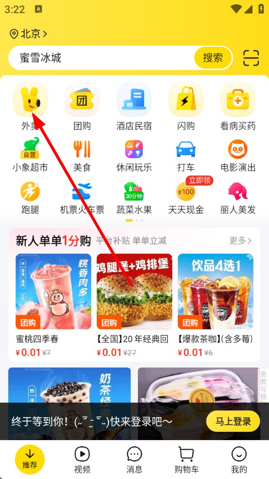 4、回到主界面后點擊“馬上登錄”,進入登錄流程,登錄完成后即可開始點外賣。