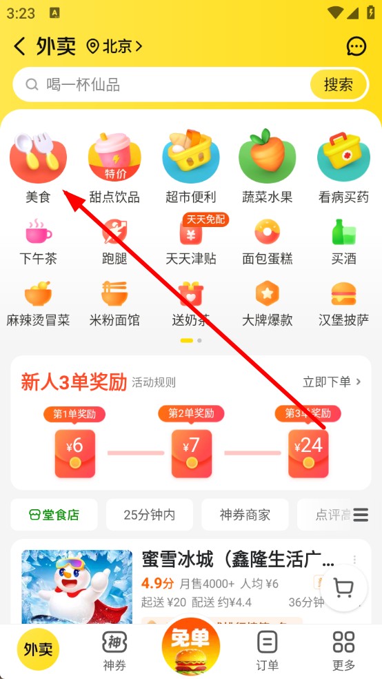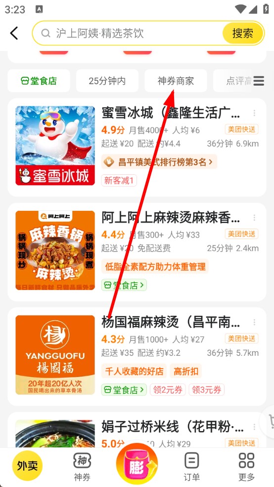 3、進入商家列表,點「神券商家」篩選,或其他類目進行選擇,選擇自己喜歡的食物進行購買。