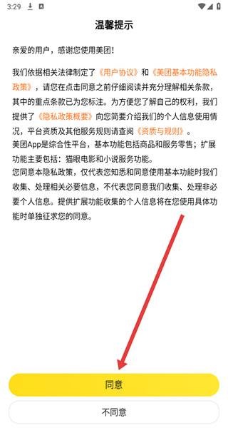 1、點擊“溫馨提示”的“同意”,進入美團主界面。