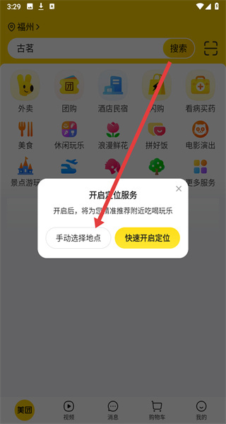 2、主界面彈出“開啟定位服務”彈窗,選擇“手動選擇地點”,進入地址選擇頁面。