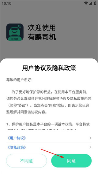 1、閱讀用戶協議及隱私政策,點擊頁面中的同意按鈕進入后續流程。