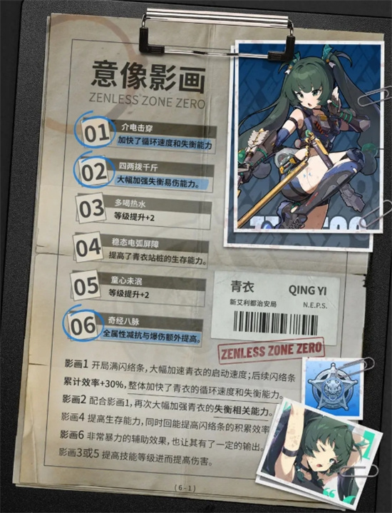 青衣是一位電屬性的擊破代理人。作為首位限定擊破C,青衣主要是通過普攻、強化特殊技、閃避反擊、終結技等手段,積累【閃絡電壓】數值,在達到條件時(【閃絡電壓】數值75%+)釋放特殊蓄力普攻將怪物打入失衡并提高其失衡易傷倍率。