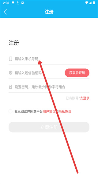 3、在進入到注冊頁面后,可以點擊輸入框填寫注冊的手機號,以便獲取驗證碼進行注冊。