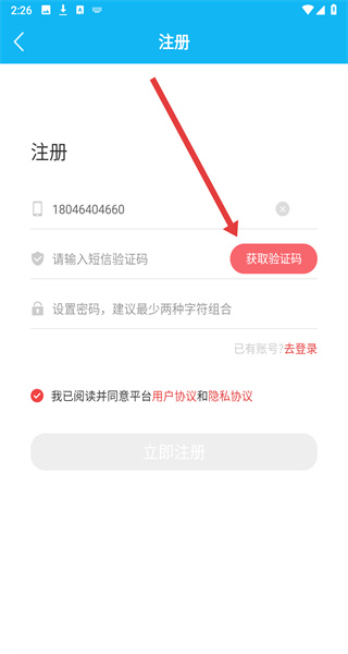 4、在填寫好手機號后,點擊獲取驗證碼按鈕進行填寫,在填寫完后續注冊信息后,即可完成注冊操作。