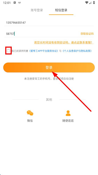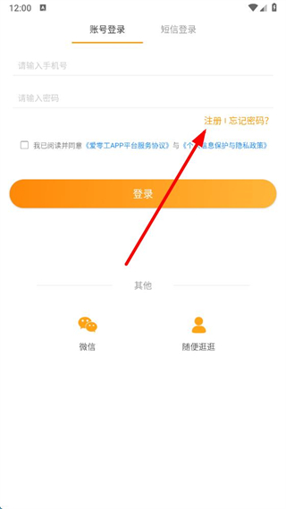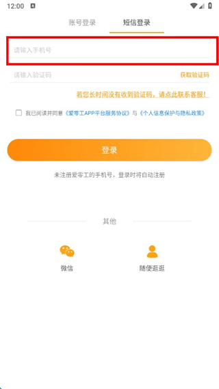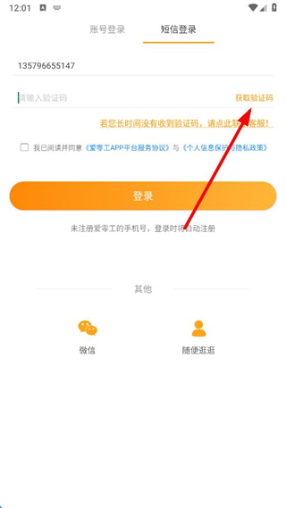 1、在愛零工app登錄界面點擊注冊選項,切換到短信登錄頁面。