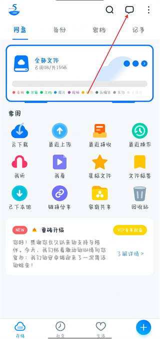 1、打開115網盤應用,點擊右上角的消息圖標。