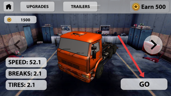2、在車庫界面查看卡車屬性(速度、剎車、輪胎)后,點擊【GO】,開始駕駛任務,踏上運輸之旅。