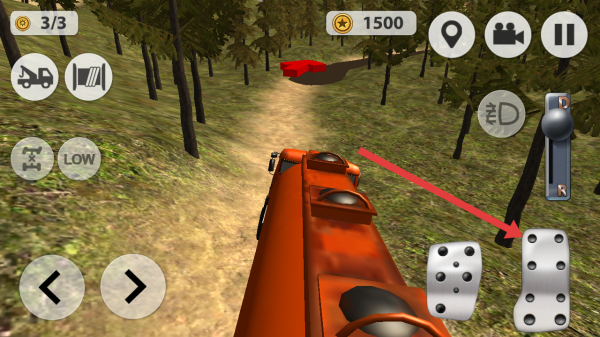3、駕駛時點擊右側油門踏板,操控橙色卡車在林間道路行駛,按紅色箭頭指引方向,完成運輸任務。