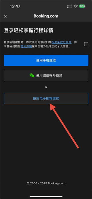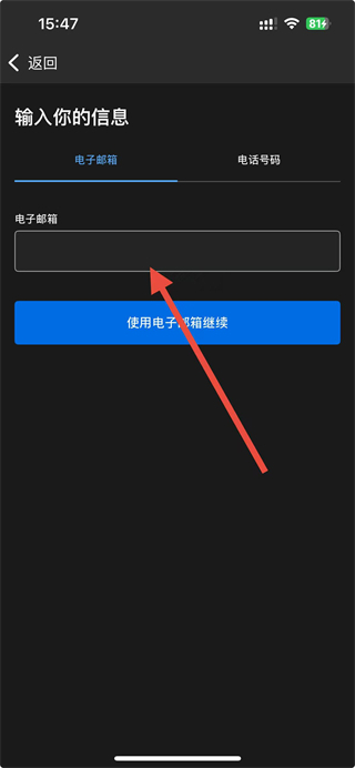 2、在登錄選擇界面,找到使用電子郵箱繼續選項并點擊,切換至電子郵箱登錄的信息填寫頁面。