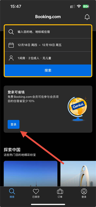 -輸入城市、地標、酒店名稱、或尋找附近住宿,輕點一下開始搜索。