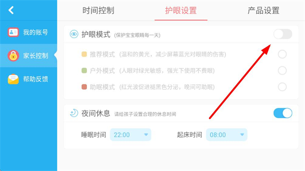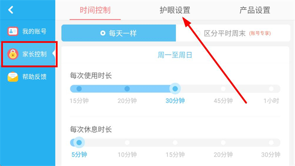 3、點擊進入家長控制頁面后,點擊頂部的護眼設置標簽,切換到護眼設置界面。