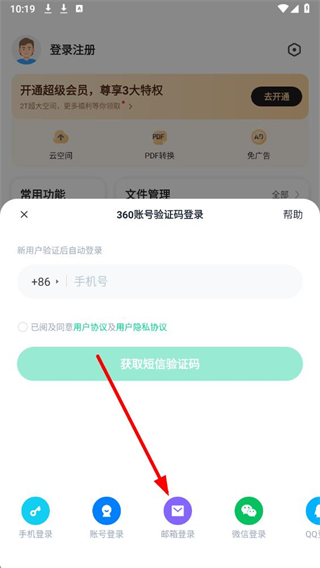 4、在郵箱登錄界面,輸入對應郵箱賬號,勾選協議后獲取并填寫驗證碼,即可完成郵箱登錄操作。