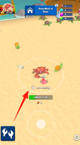 1、沙灘戰斗,點擊【箭頭】指向螃蟹,自動攻擊(Auto-Hunting),獲取資源。