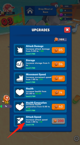2、升級界面,用金幣提升【箭頭】所指“AttackSpeed”(攻擊速度),增強戰力。