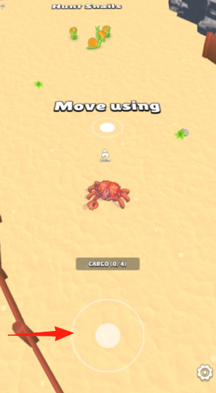 3、移動操作,按【箭頭】指示,拖動虛擬搖桿,控制角色在沙灘移動,完成任務。