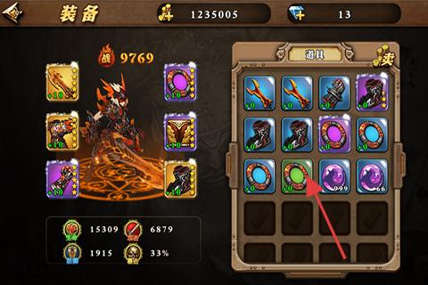 2、進入【裝備】界面,查看各類裝備道具,點擊合適的道具(如箭頭所指的道具 )進行穿戴,提升角色屬性和戰斗力。