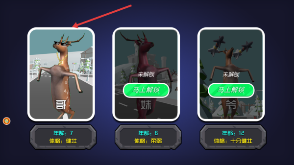 2、進入角色選擇界面后,初始可選擇哥角色,該角色年齡7歲,體格健壯;其他角色如妹、爺需通過游戲內操作解鎖。
