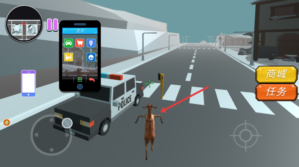 3、在游戲場景中,操控鹿角色在城市街道移動,界面會顯示手機、商城、任務等功能按鈕,可利用這些功能完成任務。