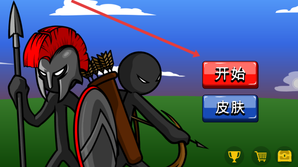 1、在火柴人主題游戲初始界面,點擊紅色開始按鈕,隨即進入游戲模式選擇頁面開啟冒險。