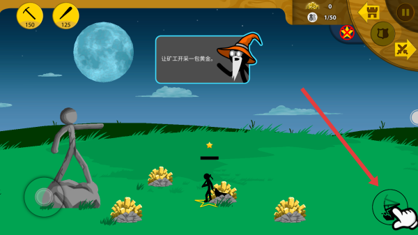 3、滑動方向鍵操控火柴人移動到礦物旁,點擊右下角對應圖標,操控礦工開采黃金,推進游戲內資源獲取進程。