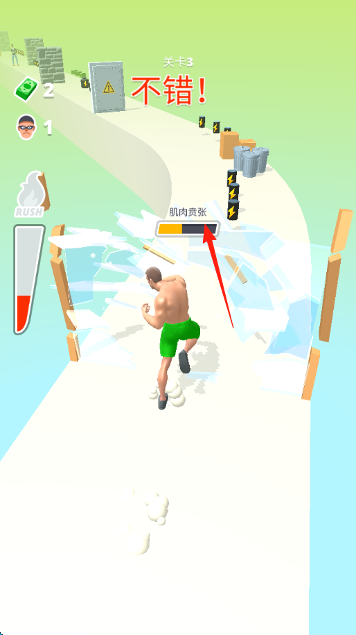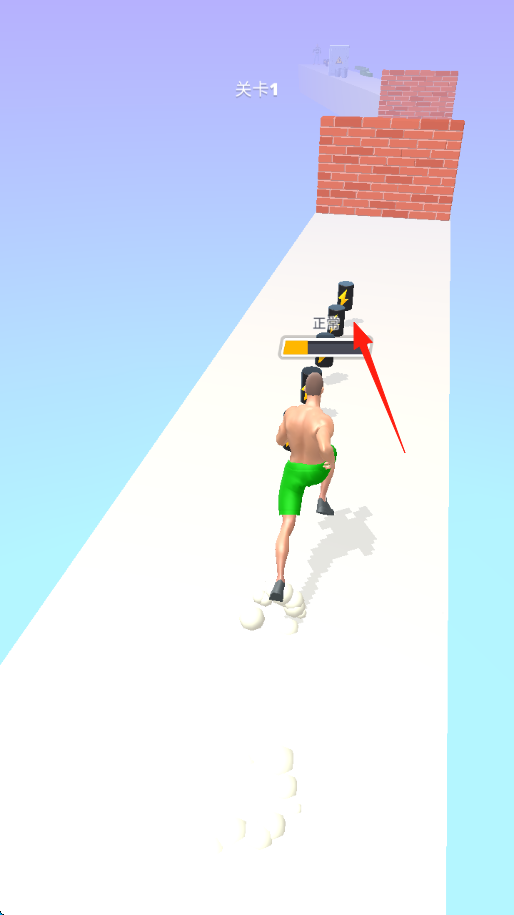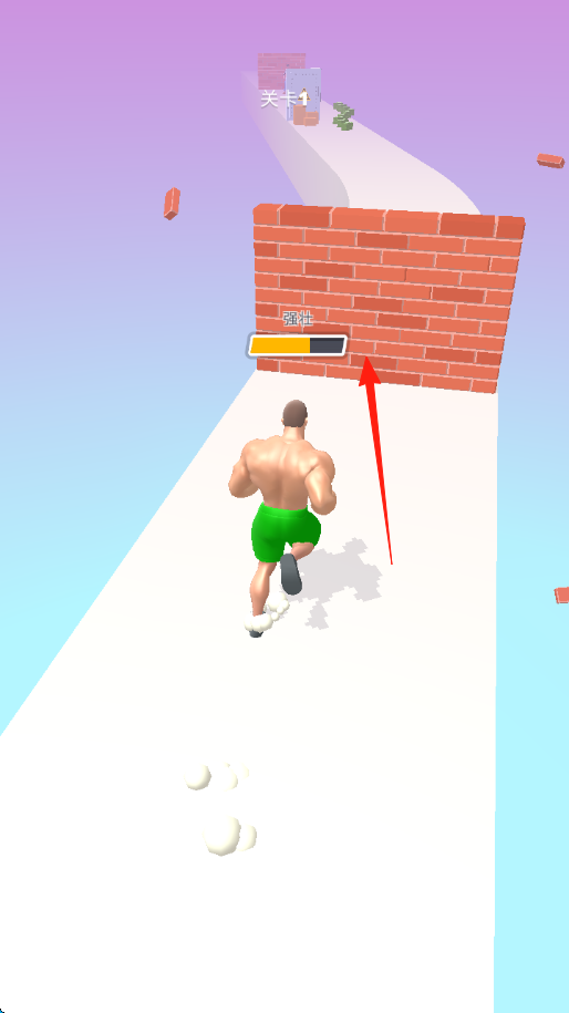 1、操控肌肉男,沿跑道沖刺,遇到磚墻顯示強壯進度條,保持沖刺,撞碎障礙,收集路上道具。